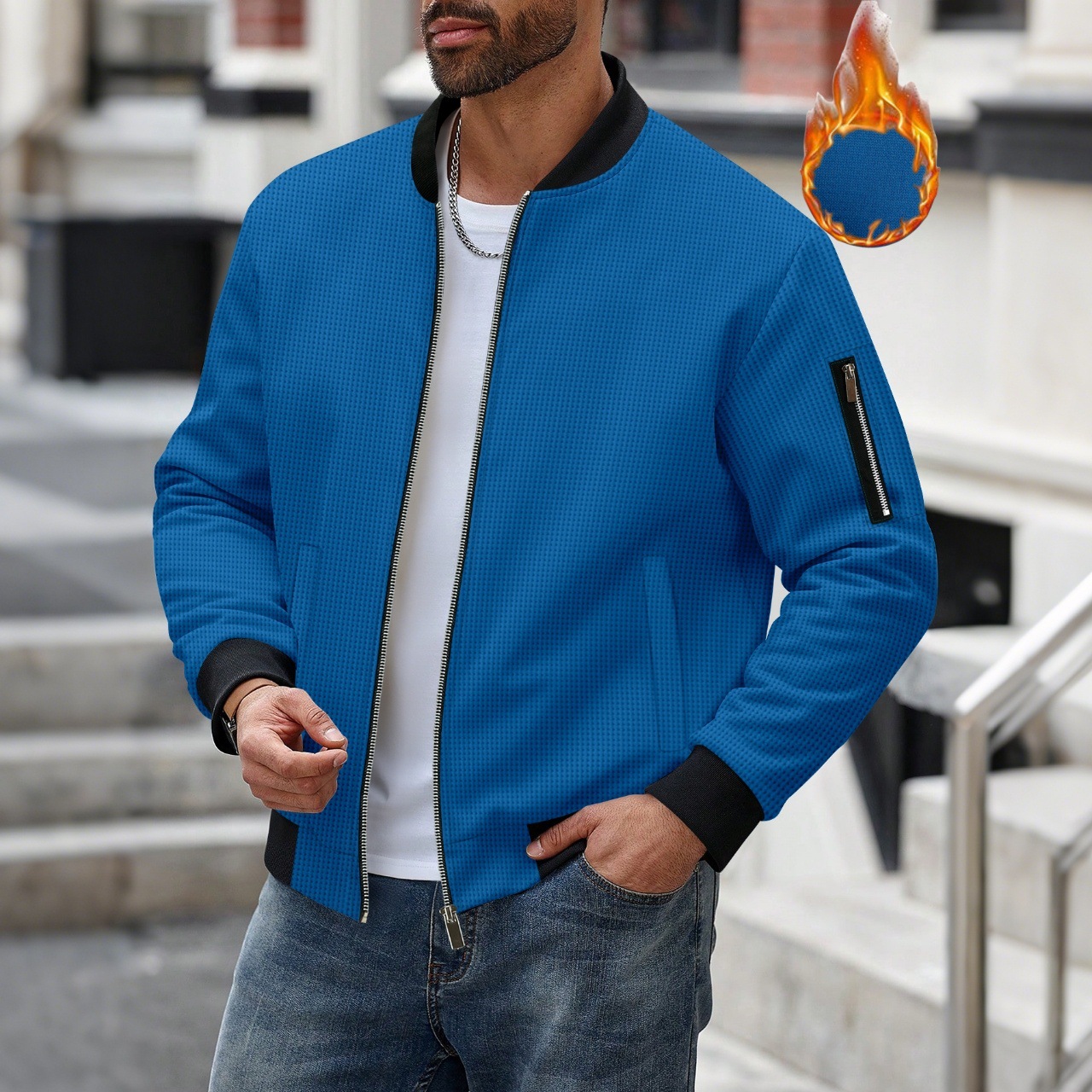 Men's Waffle Solid Color Cardigan Pocket Zipper Thickening Stand Collar Coat